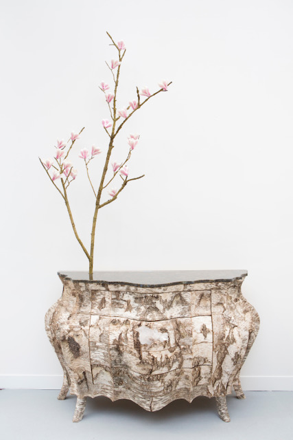 Chest of drawers in birch bark marquetry and rock crystal inlay by Sophie GALLARDO (Birch bark furniture) and magnolia branch in bronze, porcelain flowers by Samuel MAZY. Unique piece, stamped.